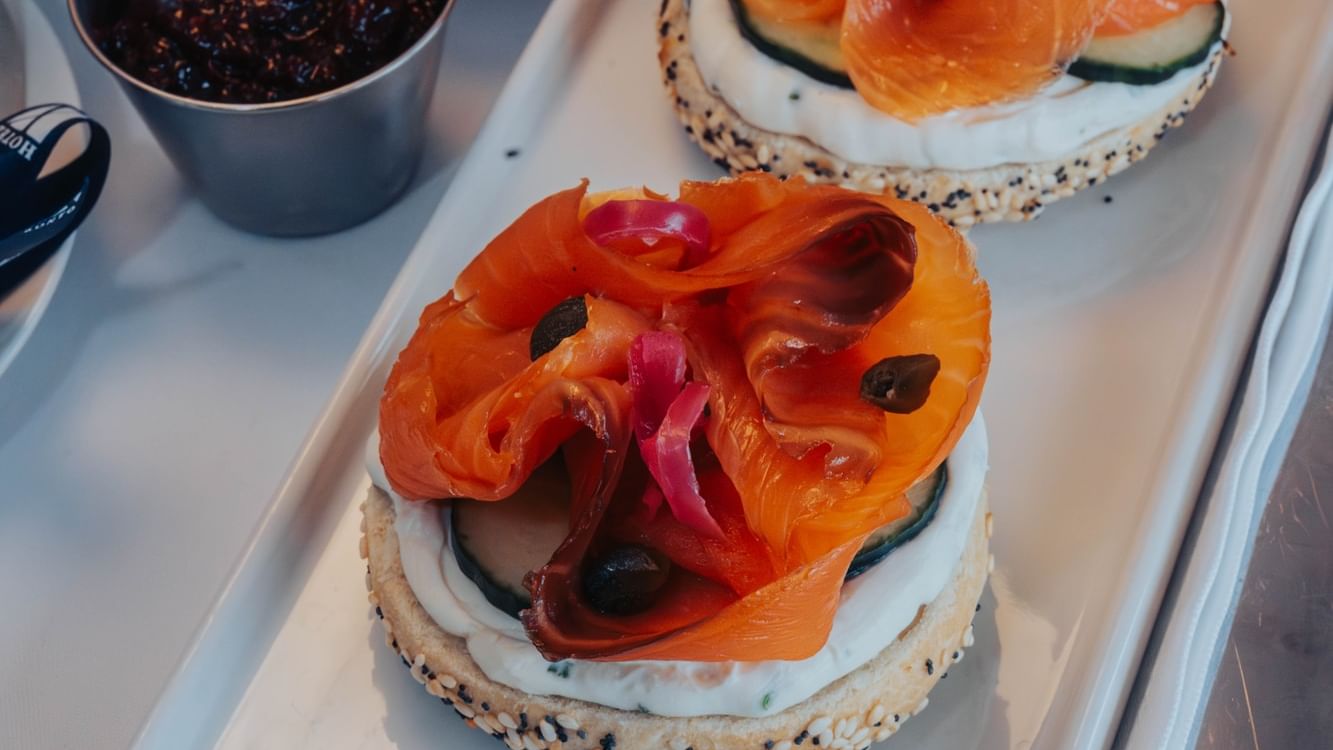 Food - soft scrambled eggs and caviar, smoked salmon bagel, pastry basket (strawberry danish, croissant roll, chive cheddar scone, chocolate chip banana bread, baguette, honey butter), smash yogurt parfait, fresh berries and watermelon